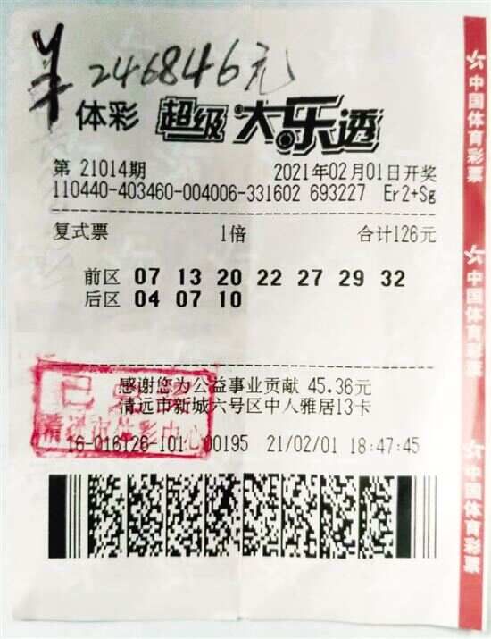 体彩大乐透第21014期开奖,摇出中奖号码为:前区“07、13、20、27、29”;后区“04、09”。当期全国共中出二等奖99注,单注奖金11.47万元。其中清远一购彩者凭借1张“7+3”小复式票中得2注二等奖及若干小奖,共揽获奖金24万多元,贡献税收4万余元。