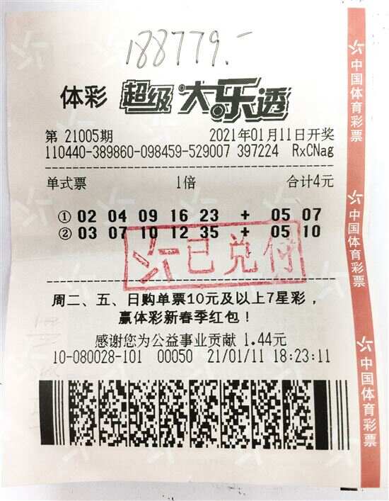 大乐透第21005期开奖,摇出中奖号码为:前区“03、07、10、12、35”;后区“03、05”。全国开出一等奖1注,奖金1000万元,二等奖中出77注,每注奖金188779元。茂名购彩者当期虽然未能擒获千万元头奖,但位于茂名信宜市人民南路158号的4410080028体彩投注站的穆先生(化名)仅用4元投注2注单式号码,就收获1注二等奖,奖金18万多元,为当地贡献税收3万余元。