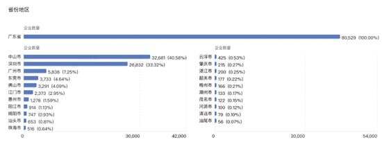 据天眼查专业版数据显示,2020年,广东省年度注册企业达9973家,年度注册增速14.14%。截至3月10日,全省共有8万多家企业符合新兴行业中的“照明灯具”企业标准,其中,中山市以3.2万余家(40.58%)的数量领跑全省,深圳市拥有2.6万余家(33.32%)照明灯具企业,两市占据全省七成以上的份额。广州市则以5838家(7.25%)照明灯具企业,位列第三。