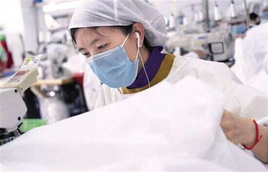 ▲ 赶制防疫物资的女工。 黄晓丽摄