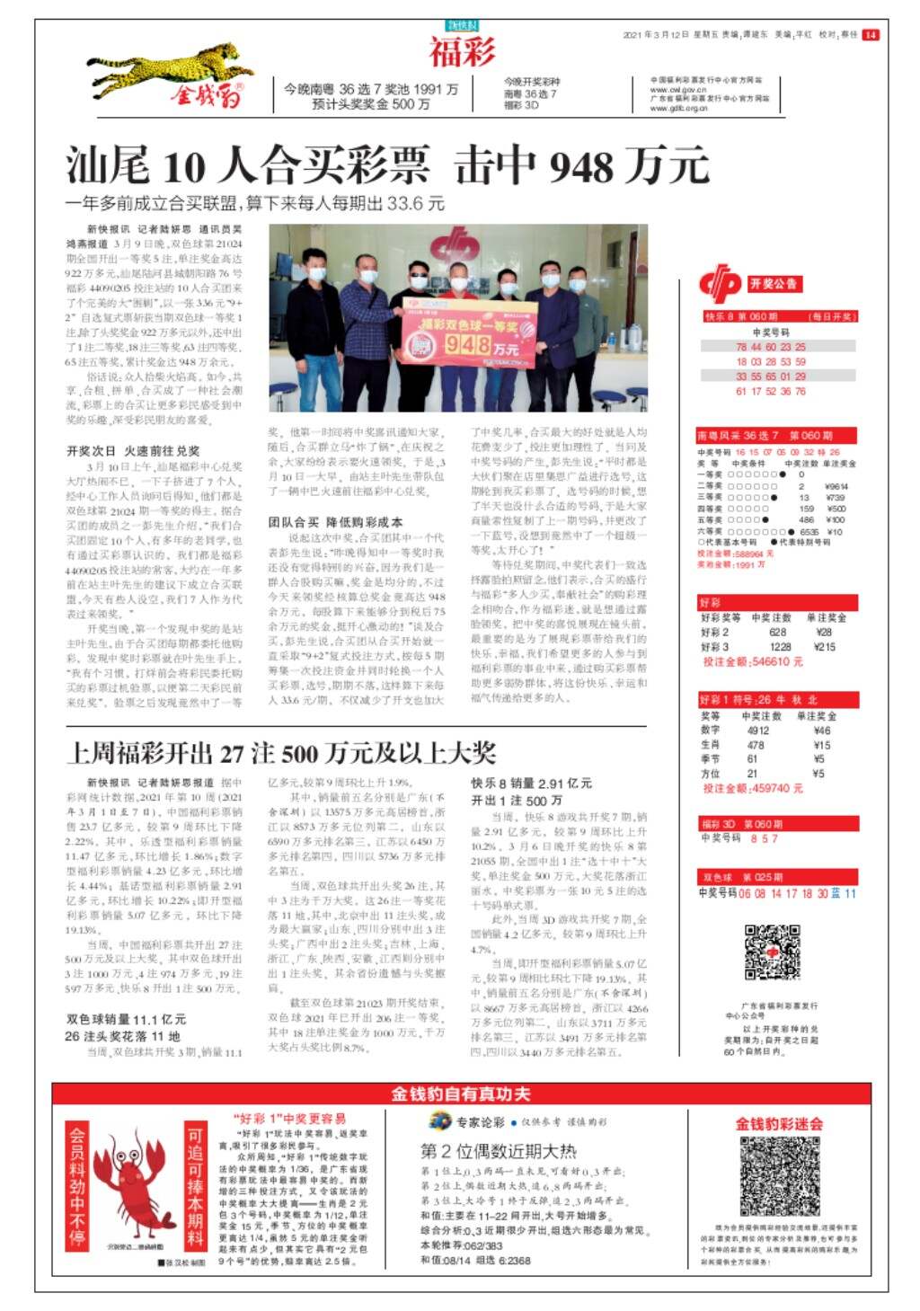 汕尾10人合买彩票 击中948万元