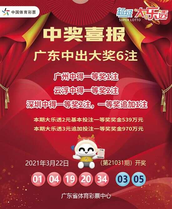 新快报讯 记者陆妍思报道 3月22日,超级大乐透第21031期开奖,广东迎来大丰收,狂中1注970万元追加一等奖及5注539万元的基本投注一等奖,其中唯一的追加头奖落户深圳,云浮则有幸运儿一票独中2注基本一等奖,单票总奖金1078万余元。