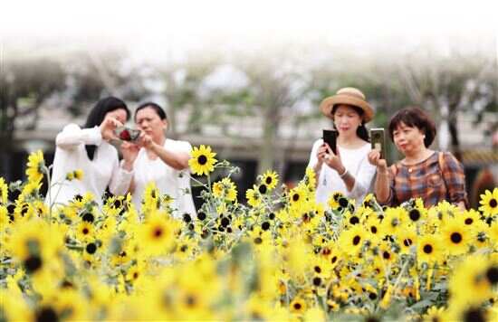 清明小长假即将来临,广州二沙岛宏城公园内向日葵花海绽放,不少市民游客前来岛上踏青赏花。