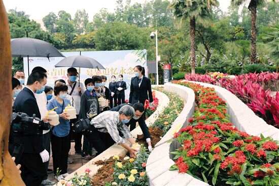 新快报讯 记者麦婉诗 通讯员廖培金 叶金鑫报道 4月5日下午,广州市银河革命公墓在生态墓区举行以“碧水青山常伴,哀思追忆永念”为主题的2021年花坛葬区集中安放仪式,为6位逝者骨灰举行集中安放仪式,让逝者入土为安、魂归自然、永享安宁。这是银河革命公墓2019年推出花坛葬以来,首次举办集中安放仪式,大力推行绿色节地生态安葬。