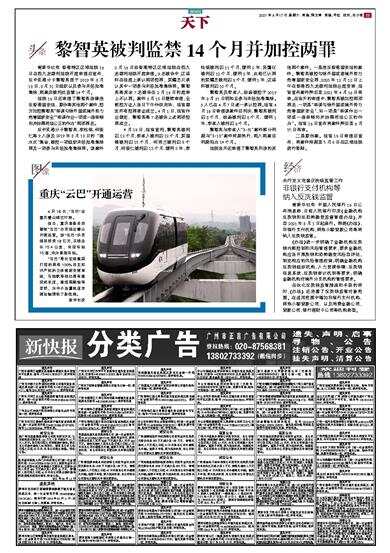 据新华社电 香港特区区域法院16日在西九龙裁判法院开庭审理后宣布,反中乱港分子黎智英因于2019年8月18日、8月31日组织以及参与未经批准集结,两案共被判处监禁14个月。
