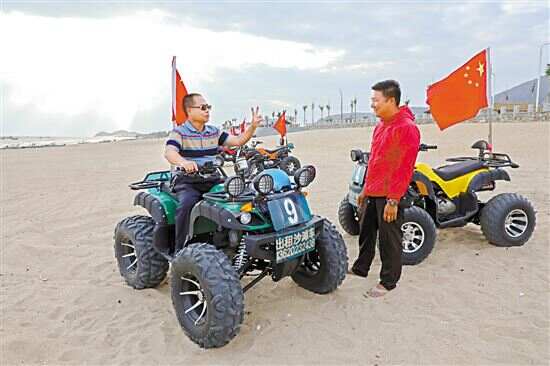 “80后”黄泽伟原本在深圳一家医院打工,看到家乡发展起来,他辞工回到洲渚村,买了十几辆沙滩摩托,摆到沙滩供游客玩,20分钟收费50元。他坦言收入要看客流情况,但在家乡能有个“事业”,比起在外面打工好多了。