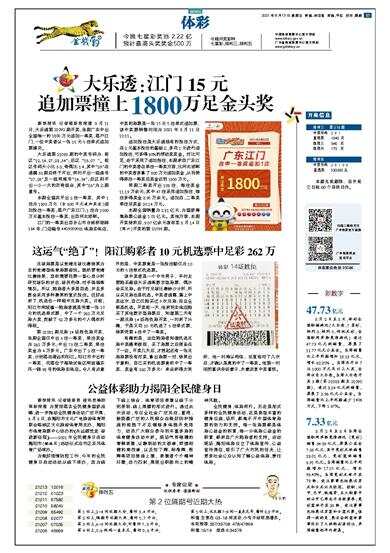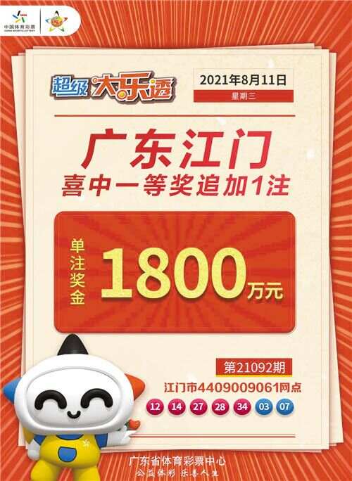 新快报讯 记者陆妍思报道 8月11日,大乐透第21092期开奖,当期广东中出全国唯一的1800万元追加一等奖,落户江门,一位中奖者以一张15元5注单式追加票建功。
