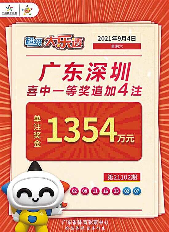 新快报讯 记者陆妍思报道 9月4日,体彩超级大乐透第21102期进行了开奖,当期全国中出13注一等奖,其中广东深圳中出4注1354万多元追加头奖,分落两家站点售出的3张彩票,总奖金达5416万多元,同期河南一票独中5注752万多元基本一等奖,总奖金达到3761万多元。
