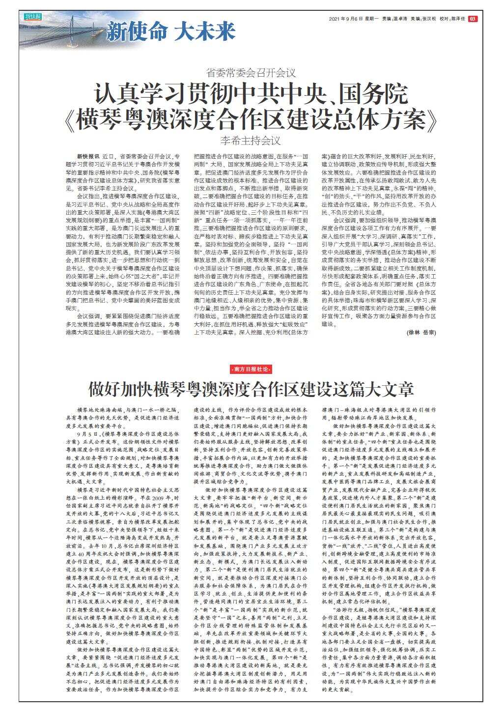 认真学习贯彻中共中央、国务院 《横琴粤澳深度合作区建设总体方案》
