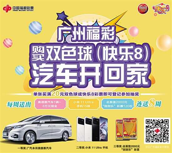 据了解,为真情回馈彩民,广州市福彩中心连续第八年重磅推出了“购买双色球(快乐8),汽车开回家”大型营销宣传活动,7月19日起,凡在广州市福彩投注站(含好易自助终端、电视购彩渠道)购买单张满20元的双色球或快乐8彩票,扫描活动二维码并通过“广州福彩”微信平台登记,即可参与汽车加现金抽奖。活动共开展8周,共送出8台广汽本田奥德赛汽车、120部小米 11 Ultra手机、价值192万元的“刮刮乐”彩票以及现金64万元。