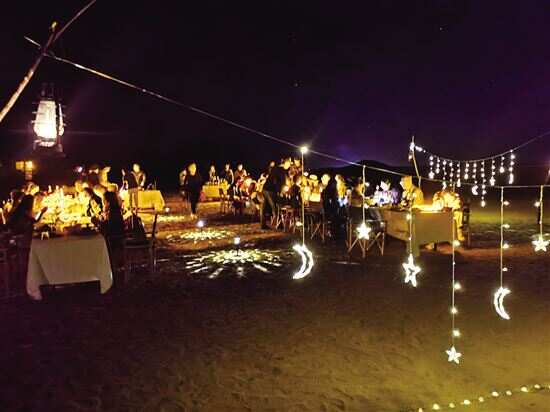 如果旅伴众多,12分推荐去定制一场大漠私宴。清凉的晚风拂面,吹来远古的西域风情,骑着骆驼缓行向前,步入与世隔绝的大漠深处。在没有遮蔽的浩瀚夜空下,美食就在灯火阑珊处。烟花奔向星光,篝火映衬笑容,漫天繁星,良辰美景。