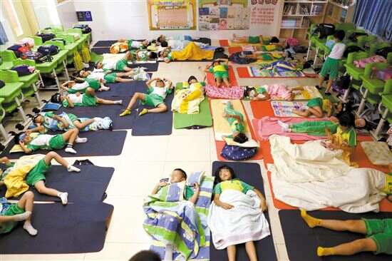 每天的12时20分,广州市番禺区南雅学校的学生们用餐完毕后,不约而同地开始忙碌起来。他们把桌椅移动至两旁,随后从睡袋中拿出睡垫、棉被和枕头,摆放在空地上。12时30分,孩子们已经全员躺平开始午睡。
