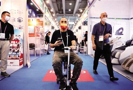 ■昨日,在日用消费品展区,境外采购商体验可以代步的行李箱等日用产品。