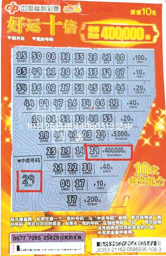 10月25日,惠阳彩民刘先生(化名)在第44080313号站点玩“刮刮乐”,中得“好运十倍”中出40万元大奖。