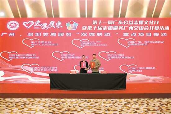 新快报讯 记者黄闻禹报道 近日,由省文明办、团省委、省志愿者联合会、广州市文明办、团广州市委、深圳市文明办、团深圳市委等单位主办的第十一届广东公益志愿文化月暨第十届志愿服务广州交流会开幕活动在广州举行。记者获悉,广州、深圳正式签约并发布志愿服务“双城联动”重点项目,在志愿服务培训培育交流、志愿服务发展标准化体系建设等方面强强联手、优势互补。