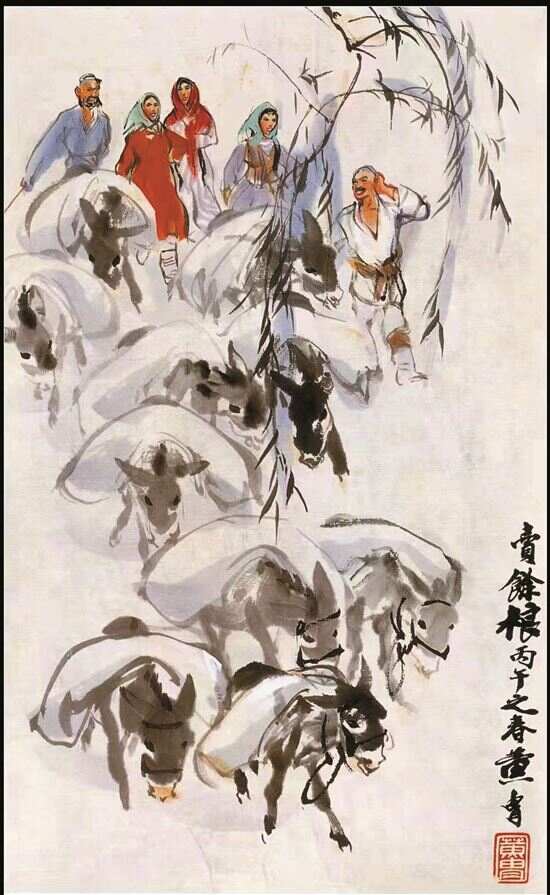 其实,黄胄不但熟悉驴,还养过驴、放过驴,在他那个年代里,他还赶过驴车卖豆腐,每次走到小酒馆的时候,他就喝一口,驴就在那等着,有时候回来的路上,驴甚至会主动把黄胄拉到小酒馆门口,然后在那里等着,特别有意思,因此,黄胄和驴的那种感情是很深的。所以,黄胄画的驴多是与人在一起的,或是赶着驴,或是放驴等等,又或者是大场面。而且驴的蹄子声像某种乐器一样,比如他的《日夜想念毛主席》,库尔班大叔骑着毛驴,弹着冬不拉,唱着赞歌,迎着朝阳向东方走去,那毛驴小尾巴在甩,就像个指挥一样,然后小蹄子吧嗒吧嗒地走,所以,这张画不但有动感,而且还有乐感,有声音的感觉,弹的琴声,老头唱的歌声,老头脚打的节奏,驴蹄子打的节奏,整张画特别好。