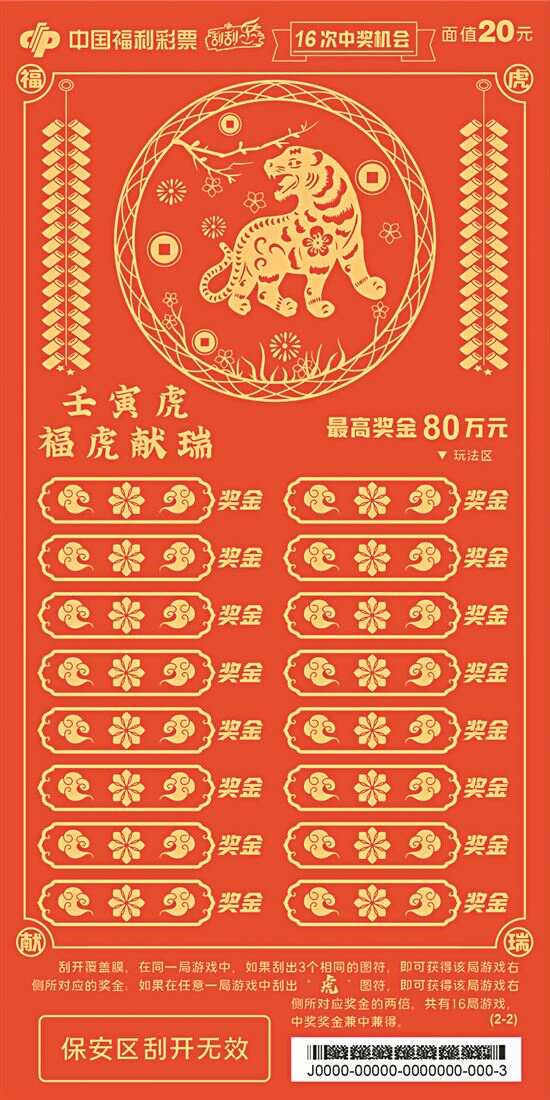 壬寅虎20元“福虎献瑞”游戏共有两款设计,最高奖金80万元。票面在延续往年生肖剪纸的设计风格基础上,创新地将传统老虎剪纸形象与新中式设计风格巧妙融合,画面以虎啸迎春为主题,四周环绕着春暖花开、鞭炮隆隆,新春的欢庆气氛跃然纸上。