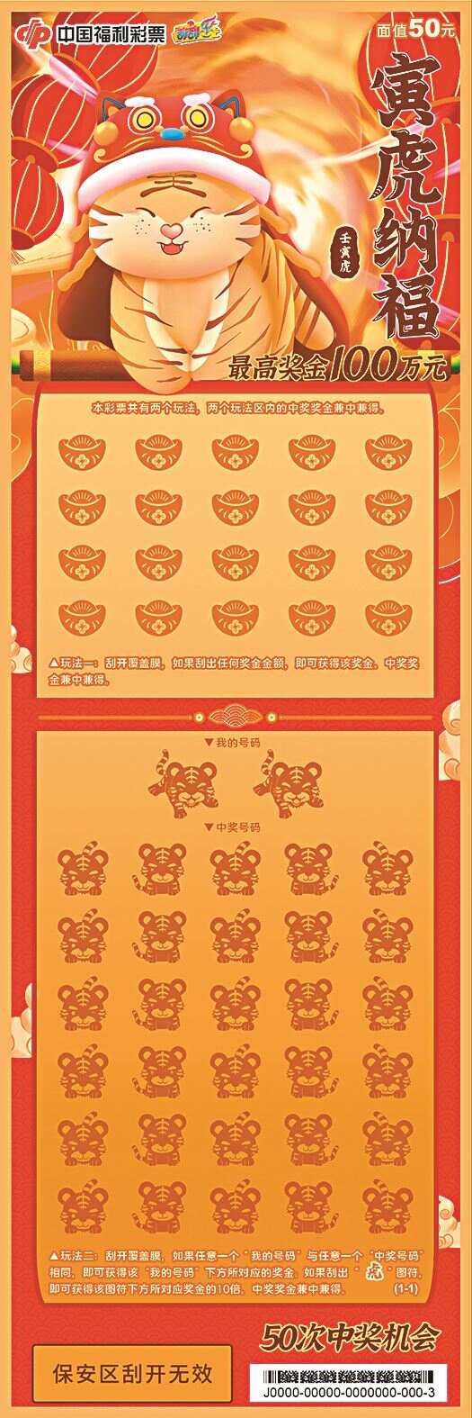 壬寅虎50元“寅虎纳福”游戏共一款设计,最高奖金100万元。画面上,生动活泼的萌虎以圆憨可爱的卡通造型登场,仿佛昂首阔步迎面走来,“头戴虎帽”寓意喜庆向上。四周配以高高挂起的大红灯笼和“寅虎纳福”书法字体,使春节年味更加浓厚。
