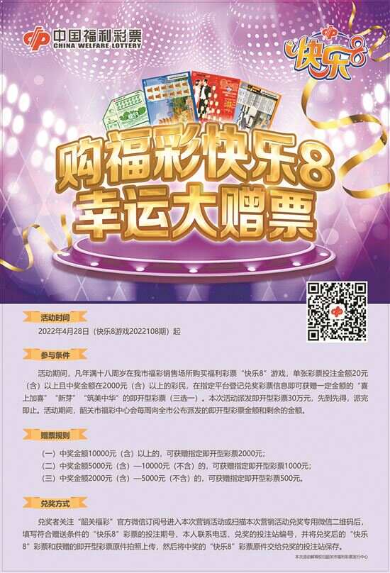 新快报讯 记者陆妍思 通讯员安琦报道 为增强快乐8游戏的社会认知度,营造公益、健康、快乐的购彩氛围,韶关市福利彩票发行中心于2022年4月28日起在全市范围内开展“购福彩快乐8,幸运大赠票”营销活动。