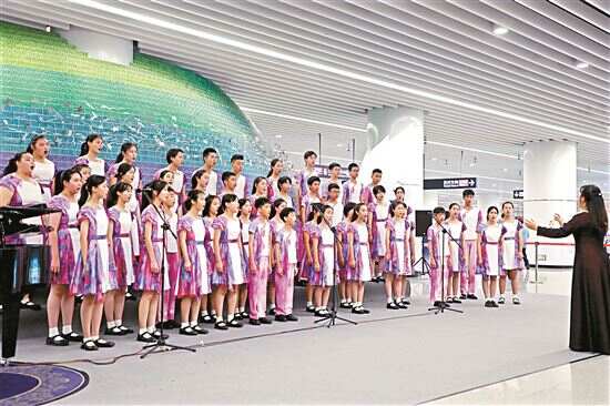 新快报讯 记者李佳文 毕志毅 通讯员李哲峰摄影报道 “谁让我们认识美丽,就是祖国大地……”在“六一”节来临之际,5月29日上午,广州地铁联合广州市越秀区少年宫小云雀合唱团,在广州地铁目前最大的车站——二十一号线天河公园站举办“云雀之声,乐享全程”地铁车站音乐空间艺术展演活动。40多名“小云雀”完美演绎了《五彩缤纷的大地》《春天到》《沙南道河》《北极光》4首名曲。过往乘客纷纷驻足倾听,跟随着动人的韵律轻轻哼唱。