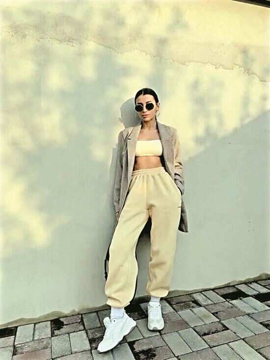 ◀运动套装挑奶油色看起来会更显柔和舒适,搭配正式一些的单品也更和谐。