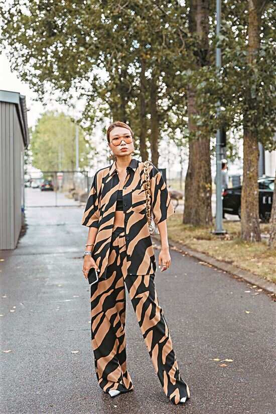 衬衫套装今季流行度也很高,棉麻、丝质衬衫套装让身体感受舒适放松,但比较容易穿出“睡衣感”,建议搭配精致感较强的配饰,两者碰撞能中和造型的随性感。
