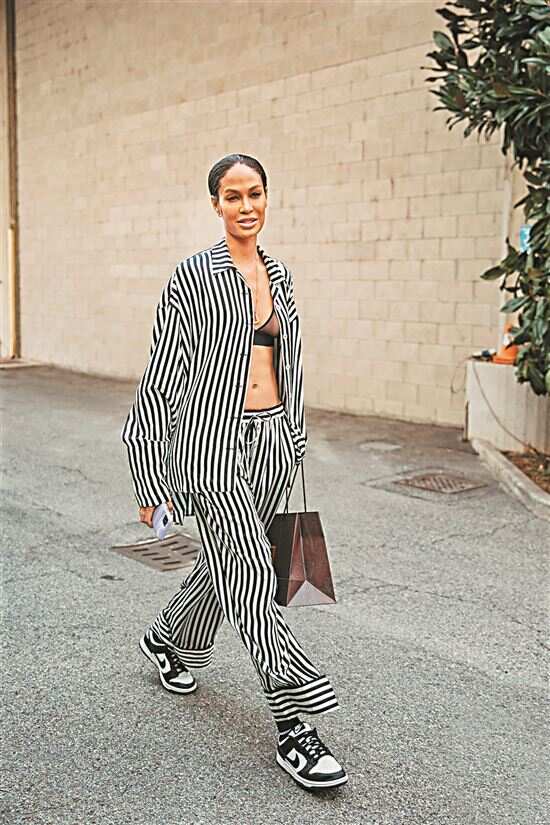 ◀全身条纹衬衫套装容易穿出“睡衣感”,建议选短裤套装,“上宽下窄”露出双腿,巧妙避免拖沓冗长。