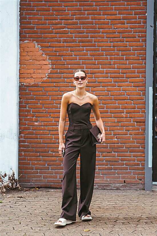 ▶西装面料的抹胸也是出彩选择,清凉之余不失简洁干练。