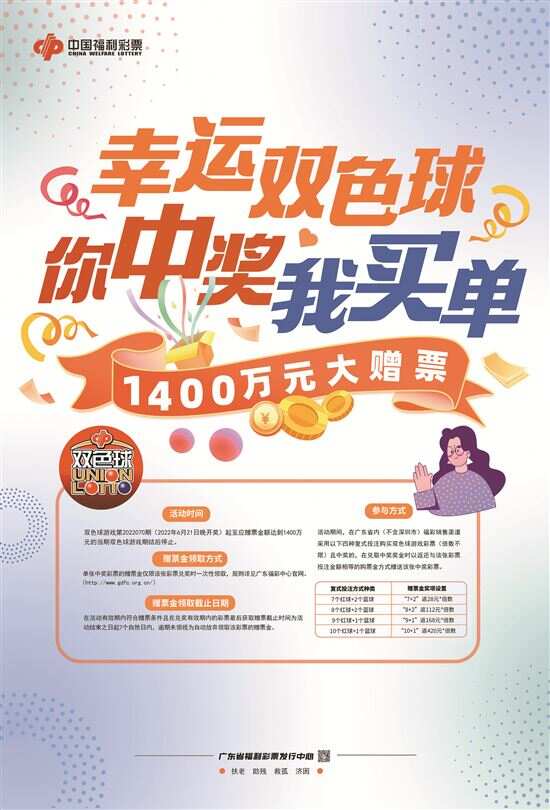 根据活动规定,活动期间,在广东省内(不含深圳市)福彩销售渠道采用“7+2”(28元)、“8+2”(112元)、“9+1”(168元)及“10+1”(420元)四种复式投注方式购买双色球游戏彩票(倍数不限)且中奖的,在兑取中奖奖金时以返还与该张彩票投注金额相等的购票金方式赠送该张中奖彩票。