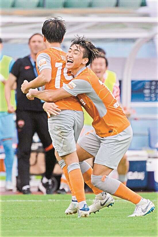 ■深圳队徐越(左)进球后与队友张源庆祝。新华社发