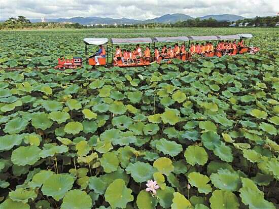 7月2日,游客乘坐观光“小火车”在云南景洪市勐罕镇龙德湖赏荷(无人机照片)。