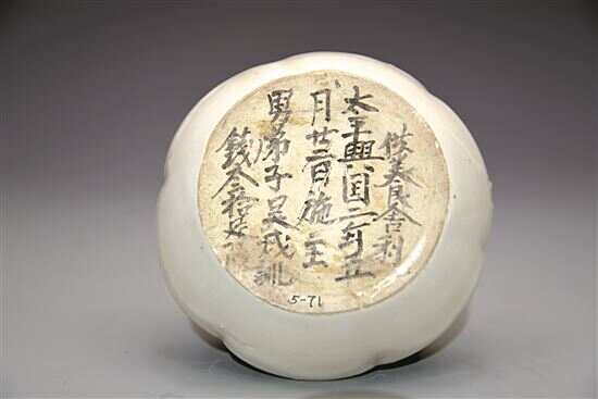 ■北宋,定窑白釉双蝶纹花口盘(盘底有墨书),河北定州静志寺塔基地宫出土,定州市博物馆藏