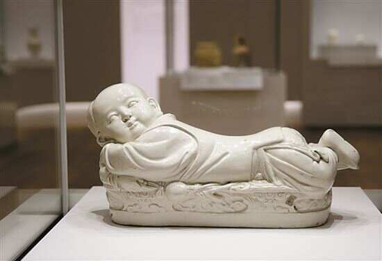 ■2022年6月28日在香港故宫文化博物馆拍摄的北宋定窑白釉孩儿枕。新华社发