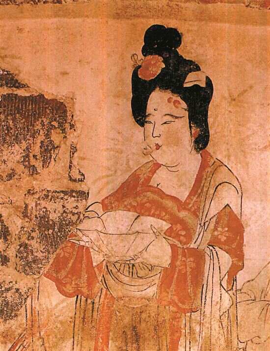■五代,侍女捧葵口碗,河北曲阳王处直墓壁画