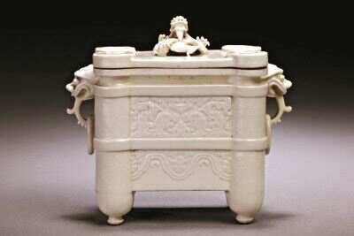 ■清乾隆,仿定窑白釉凸蟠螭纹兽耳活环四足方盖炉,高11.7厘米,故宫藏。从故宫博物院藏传世品看,乾隆时期仿定窑白瓷,主要仿其釉色,而造型和纹饰均保留有鲜明的时代特征。此种式样的香炉盛行于乾隆时期,除白瓷制品外,尚见有玉、珐琅、玻璃质等,多与瓶、盒等成套使用。