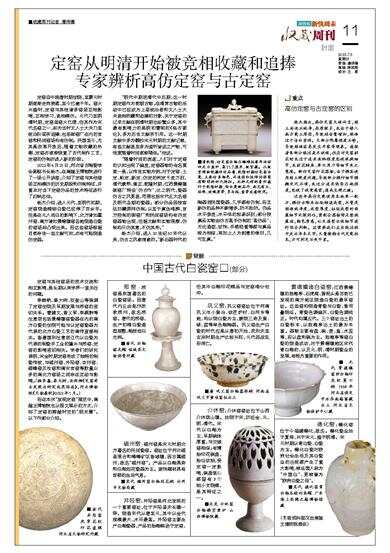 “随着时间的流逝,人们对于定窑的认知出现了偏差,定窑器物的命名莫衷一是,以传世实物为例,对于定窑、土定、粉定、新定、仿定的判定千差万别,清代康熙、雍正、乾隆时期,江西景德镇御窑厂特设‘仿古作’,比之明代,瓷器仿古之风更甚,范围包括宋代五大名窑及明代各朝的瓷器。部分仿品因按宫廷旧藏原样仿制,以至于真伪难辨,官方控制的御窑厂和民间窑场均有仿定窑器物出现,但据文献和实物观察,仿制均只仿其意,不仿其形。”