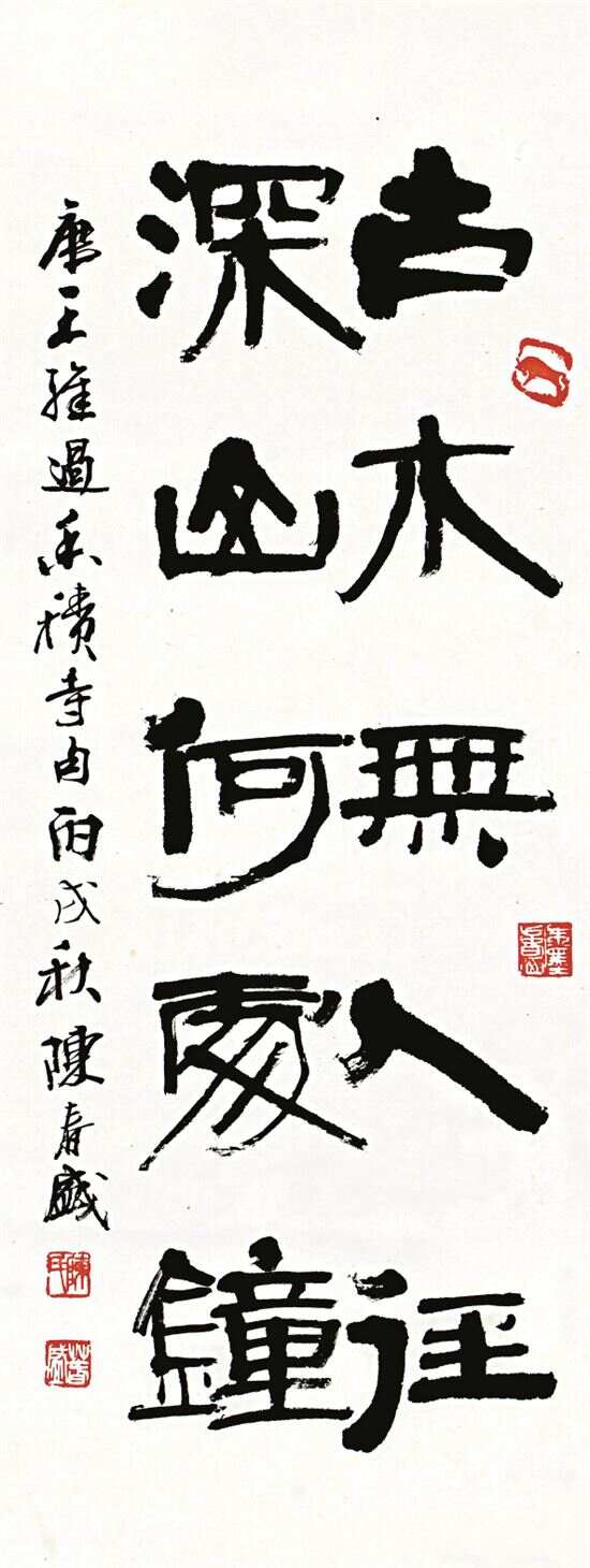 陈春盛:线条要立体,有力量、有韧性、有张力。那么,怎样的线条才具备这样的特点?比如一条钢筋,它很有力量,也很立体,但它并不是最好的,因为它太生硬,没有弹性;再如一条绳子,它放着的时候,也算立体,但它也不是好的,因为它没力、太软,更谈不上张力;最好的应该像藤条,既立体,表面不光滑,有韧性,有力量,也有弹性。所以,如果线条能写出像藤条一样,那就是最好的。我挥毫时,常会联想到唱歌。如果线条用歌声形容,那么细线条最好能写出像邓丽君的歌声一样,轻声的时候,很清晰,也有韧性,非常有韵味;粗线条就像戴玉强的高音,粗犷、雄强,有很强的穿透力。