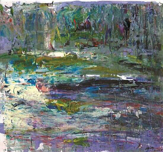 王立中的作品远远看过去,像油画,但它是丙烯与宣纸的结合,有些地方,甚至有中国画用笔的影子。可以说,王立中创作的文化底蕴源自东方,技法美学借助了西方绘画,色彩运用受了印象派影响,最终表现出具有东方韵味的意象绘画。