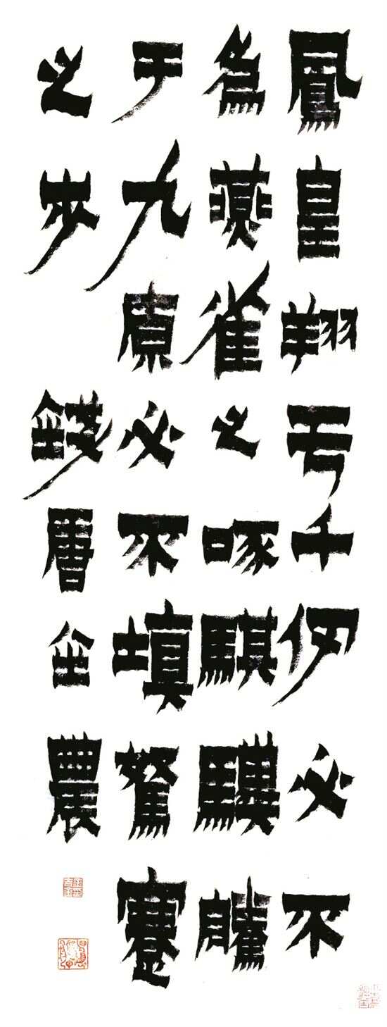 入仕无望后的金农呐喊着“耻向书家作奴婢,华山片石是吾师”,从而开始抛弃传统,抛弃正统的书法技法,潜心研究,在自己的生活中总结自己的书法艺术样式。他继承和发展了“飞白书”,“八分体隶书”形成了历史上有名的“漆书”。