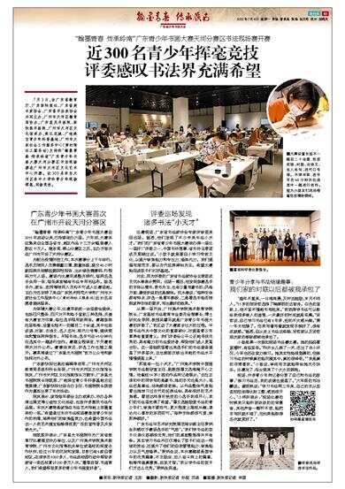 7月3日,由广东省教育厅、广东新快报社、广东省美术家协会、广东省书法家协会共同主办,广州市天河区教育局协办,广东星光书画院、新快报书画院、广州市天河区文化馆承办,珠江花城、广地珠宝青少年科普基地、广州市大家社会工作服务中心(黄村街社工服务站)支持的“翰墨青春 传承岭南”广东青少年书画大赛天河分赛区书法现场赛在广州市天河区文化艺术中心开赛。近300名来自天河区各中小学的青少年现场挥毫,同场竞技。