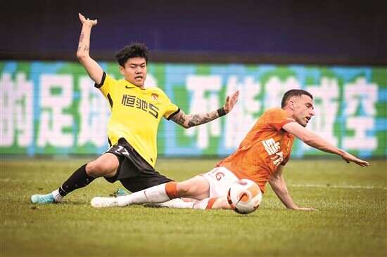 ■武汉长江队球员卡耶维奇(右)与广州队球员杨立瑜拼抢。新华社发