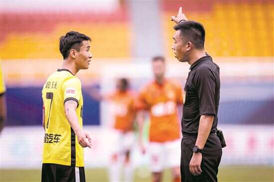 ■广州队球员韦世豪(左)与主裁判戴弋戈交流。新华社发
