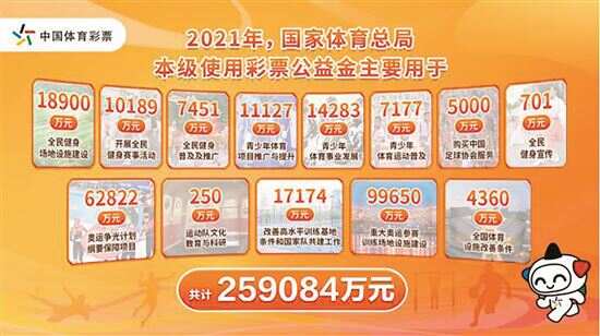 近日,国家体育总局公布“2021年度本级体育彩票公益金使用情况公告”。2021年度,国家体育总局本级使用彩票公益金259084万元,用于开展群众体育和竞技体育工作,其中群众体育使用74828万元,竞技体育使用184256万元。在彩票公益金的大力支持下,不管是城市社区还是乡村街道,处处都能感受到体育活动为生活带来的美好,体育彩票公益金更是全民健身和竞技体育最强有力的后盾,为体育强国和健康中国的建设添砖加瓦。