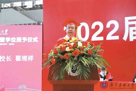 他带领毕业生们回顾了学校近年来的建设发展成就,回忆了丰富多彩的在校生活,勉励毕业生们让个人选择与时代脉搏同频共振,拥抱时代之变,以实干笃定前行。他勉励各位同学在今后的时光里,做到初心不改,信心不减,恒心不移,做攻坚克难的行动者,当不畏风雨的追梦人,让青春在为祖国、为人民、为民族、为人类的奉献中绽放出更加绚丽的光彩。