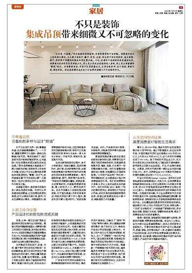 “无吊顶,不装修。”作为装修的顶部装饰,吊顶的重要性不言而喻。消费者对室内上层的美化需求,正从厨卫到客厅、餐厅、卧室、过道、阳台等不同空间延伸,结合取暖、换气、照明等不同模块的集成吊顶应势兴起。不过,这看似不甚起眼的家居建材品类,消费者对其评价往往是两极分化,要么是分享成功经验供他人参考,要么是分享惨痛的“踩坑”经历。对消费者而言,吊顶不仅要质量过关,还要功能多样、设计美观、智能可控、绿色环保。而这些新需求也为这个行业带来细微又不可忽略的变化。