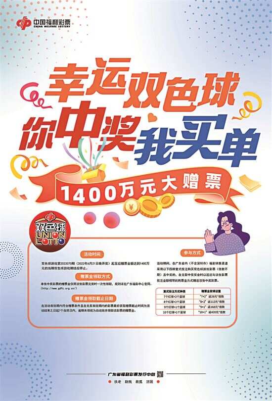 广东省福彩中心自6月21日起在全省范围内(不含深圳市)开展了“幸运双色球,你中奖我买单”1400万元赠票活动。活动针对4种双色球复式投注方式开展赠票活动,在全省(不含深圳市)福彩销售渠道(含投注站、便携投注终端、好易投注终端等),采用“7个红球+2个蓝球(7+2)、8个红球+2个蓝球(8+2)、9个红球+1个蓝球(9+1)和10个红球+1个蓝球(10+1)”4种复式投注方式购买双色球游戏彩票(倍数不限),如该张彩票中奖即可获得与该张彩票投注金额相等的赠票金,赠票金随兑奖时一并领取。截至7月12日,活动已累计赠出彩票约1128万元,剩余赠票资金约272万元,赠票活动预计还可持续2-3期。