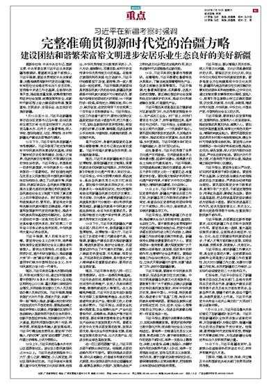 7月12日至15日,习近平在新疆维吾尔自治区党委书记马兴瑞、自治区政府主席艾尔肯·吐尼亚孜陪同下,先后来到乌鲁木齐、石河子、吐鲁番等地,深入学校、国际陆港区、社区、博物馆、农村和新疆生产建设兵团等进行调研。
