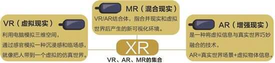 MR(混合现实)可以直接看作是VR/AR结合体,指的是合并现实和虚拟世界后产生的新可视化环境,技术难度相对更大。XR是“扩展范围(extended-range)”的缩写, 一般认为是VR/AR/MR三者的集合、统称。随着人类的交互方式将由2D交互向更具效率的3D交互转变,3D视觉交互系统将取决于虚拟现实(VR)、增强现实(AR)和混合现实(MR)的发展,这些技术统称为“扩展现实”(XR)。