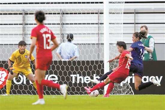 ■7月20日,在日本爱知县丰田市举行的2022东亚杯女足比赛中,中国队2:0战胜中国台北队,张琳艳(右二)在比赛中射门首开纪录。新华社发