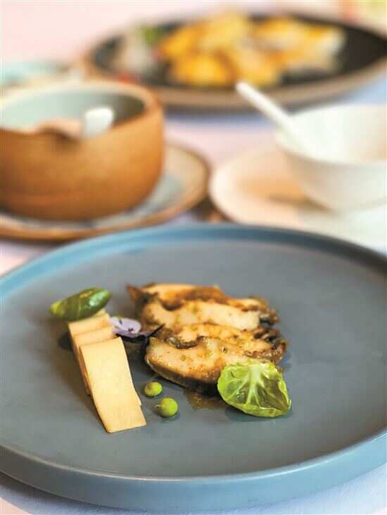 于是,在有着20多年烹饪经验的黄师傅手下,凭借深厚功底,根据“熊猫笋”甜爽的天然特性,研发出一系列“笋嘢”的菜式,从前菜的葱油拌熊猫笋到金桔熊猫笋炖鲍鱼汤,再到煎烹三头鲍伴油焖熊猫笋,最后以一道用熊猫笋与手剁黑毛猪肉做馅儿的煎饺收结,从头鲜甜到尾,回味无穷。